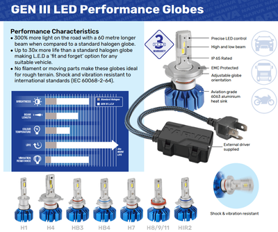 With a removable locator ring, external driver and 360° adjustable globe orientation (H4 & H7 globes only), GEN III Performance L.E.D Globes can be retrofitted at home.